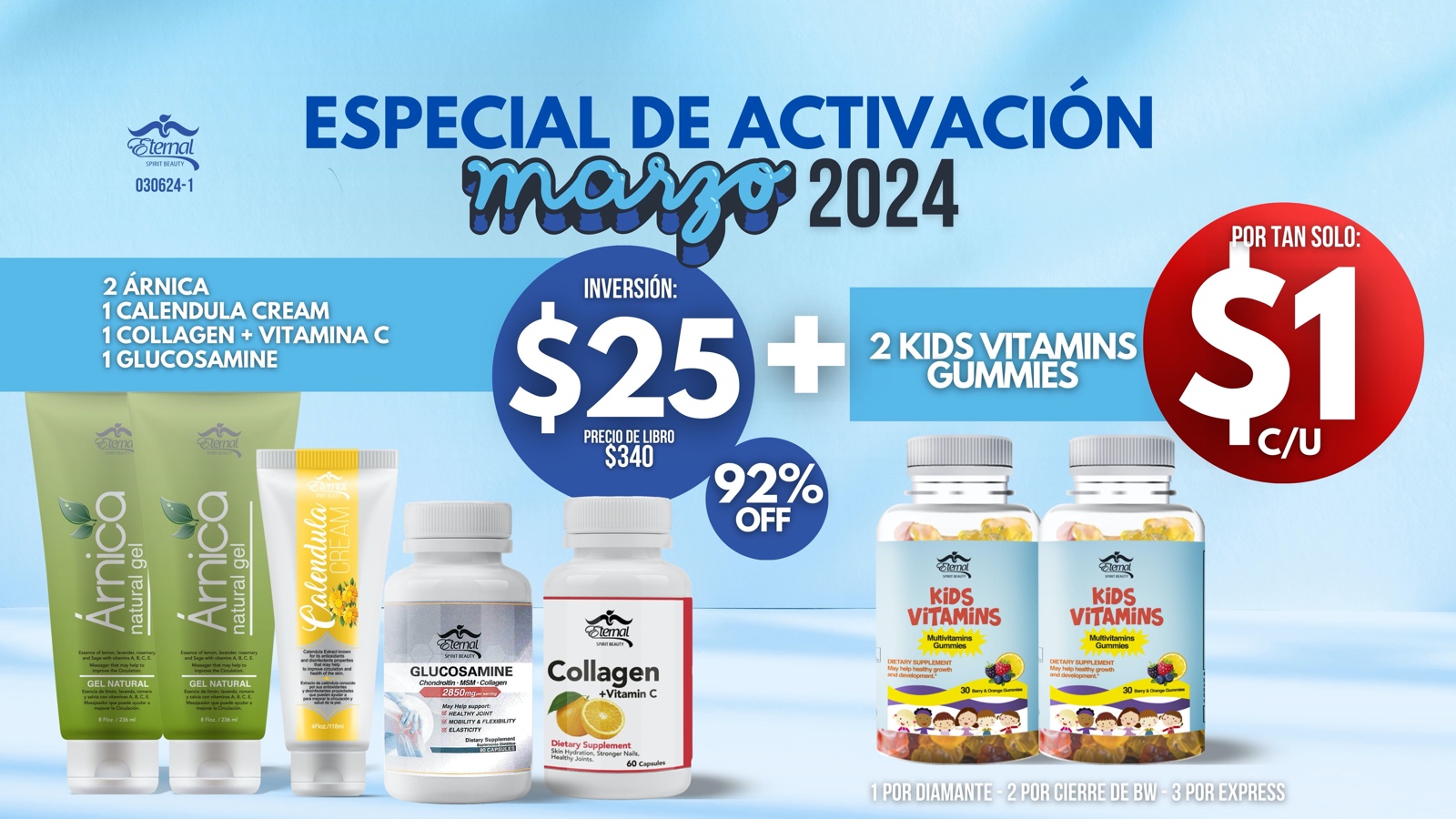 Incluye: Especial Activacion Marzo 2024 2 Arnica 1 Calendula Cream 1 Collagen + Vitamin C 1 Glucosamine 2 Kids Vitamins 30 Berry & Orange Gummies